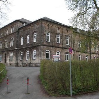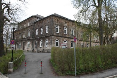 Baudenkmal D-4-63-000-24 in Coburg im Ortsteil Coburg, Ehem. Krankenhaus des Coburger Landes, dreiflügeliger zweigeschossiger Walmdachbau aus Sandsteinquadern mit Eckpilastern und Blendbogenfries, mittig im Hauptflügel und Südflügel je ein Zwerchhausrisalit, romanisierend und gotisierend, von Wilhelm S