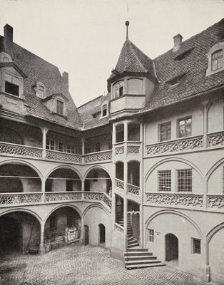 Krafftsches Haus, Ämtergebäude, ehem. Haus zur goldenen Rose bzw. Welserhaus, jetzt zum Rathauskomplex gehörig, drei- bis fünfgeschossige Vierflügelanlage um einen Innenhof, ehem. Sandsteinquaderbau, 1509-12 von Hans Behaim d. Ä., mit Ergänzungen von 1550/60, Wappen.