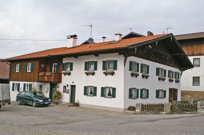 Baudenkmal D-7-77-173-32 in Halblech im Ortsteil Buching, Bauernhaus, zweigeschossiger Flachsatteldachbau mit reichem Bundwerkgiebel, Tennenbundwerk, enggereihter Kopfbüge an der Traufseite und diagonalen Stichbalken, Ende 18. Jh.