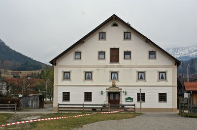 Baudenkmal D-7-77-173-48 in Halblech im Ortsteil Buching, Bauernhaus, zweigeschossiger Satteldachbau mit Rustika, Ecklisenen, Gesims- und Putzgliederung, im Kern 18. Jh., sowie Eingangsportal mit stuckierter und bemalter Supraporte, Ende 19. Jh.