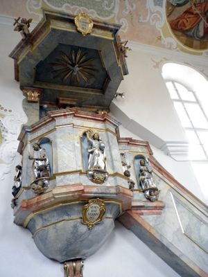 Kanzel, Kanzel in der katholischen Pfarrkirche St. Quirin in Ammerfeld, einem Ortsteil der Gemeinde Rennertshofen im oberbayerischen Landkreis Neuburg-Schrobenhausen