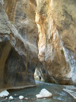 Die Sarakina-Schlucht erstreckt sich über 1.5 Kilometer mit vertikalen Wänden bis zu 150 Meter Höhe und Durchgängen zwischen 3 und 10 Metern Breite.