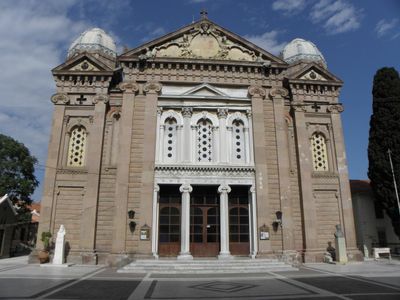 Saint Therapon ist eine orthodoxe Kirche im Hafenviertel von Mytilene mit einer großen zentralen Kuppel, die über die Nachbargebäude hinausragt. Das Gebäude verbindet griechische und westeuropäische Stilelemente mit Dekorationen an der Fassade.