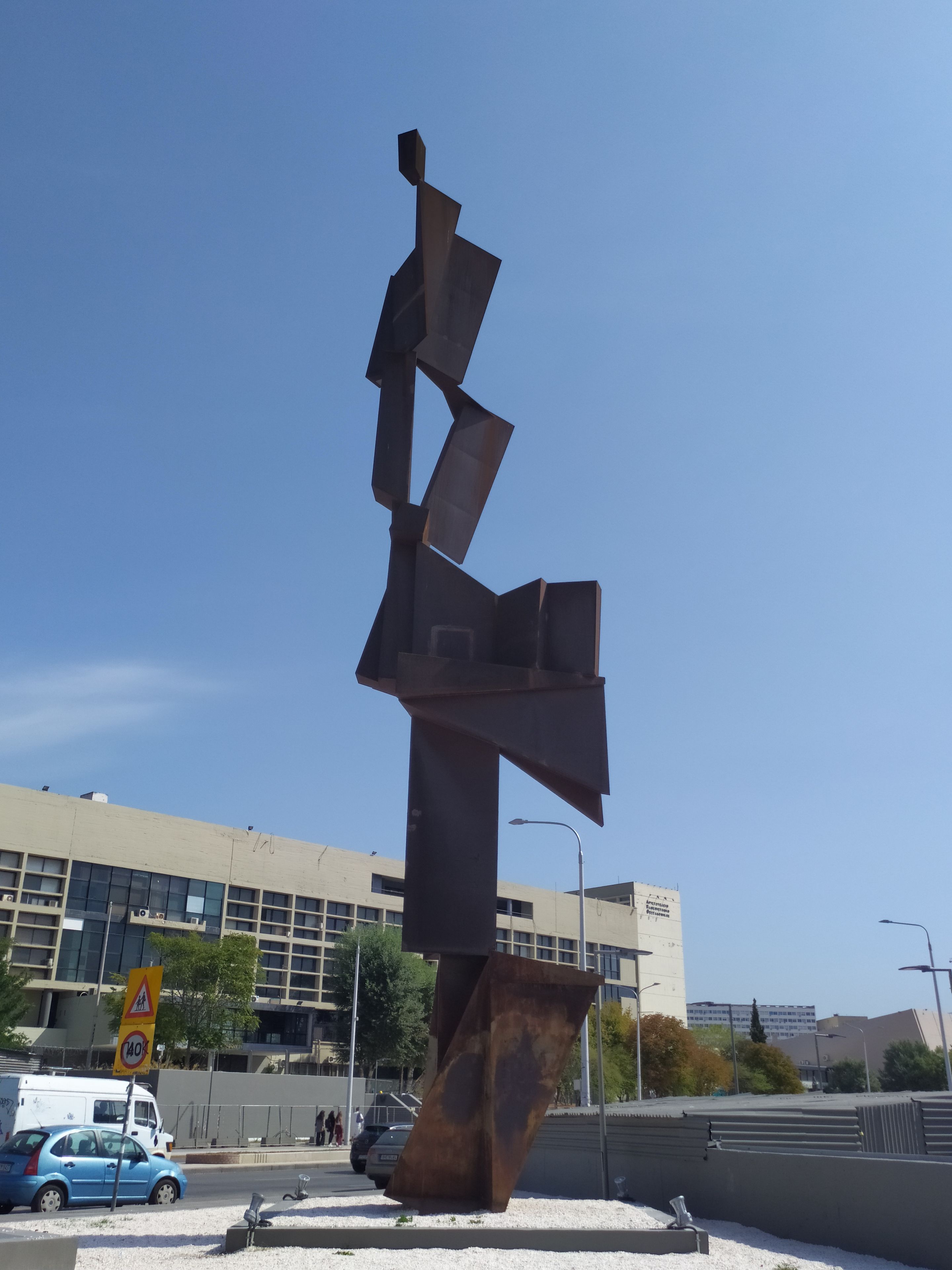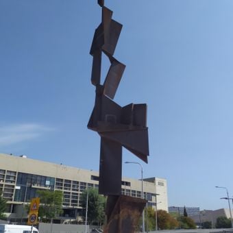 Die 17 Meter hohe Metallskulptur steht am Nordeingang der Internationalen Messe Thessaloniki und zeigt abstrakte geometrische Formen.