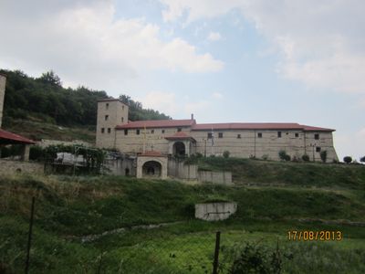 Das Kloster befindet sich auf 990 Metern Höhe an den südwestlichen Hängen des Olymps, mit dicken Steinmauern und vergitterten Fenstern.