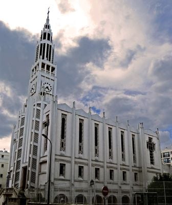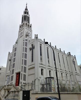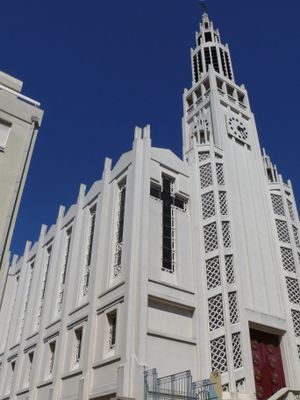 Die Saint-Jean-Bosco-Kirche verfügt über einen 53 Meter hohen Turm, Stahlbetonkonstruktion und geometrische Muster der 1930er Jahre Architektur.