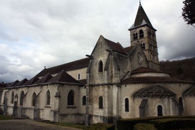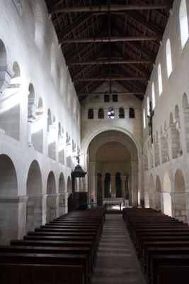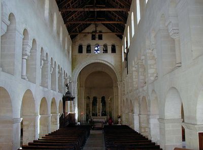 Die Kirche zeigt ein frühes Beispiel für einen Umgang mit Radialkapellen und enthält Säulenkapitelle mit grundlegenden skulpturalen Elementen.