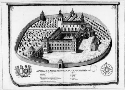 Die Abtei Sankt Maria zeigt einen lateinischen Kreuzgrundriss mit mehreren Kuppelabschnitten und Steinmetzarbeiten in der gesamten Struktur.