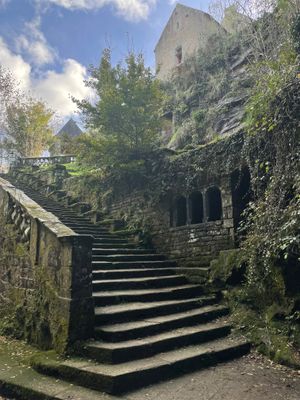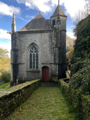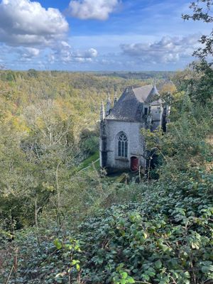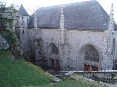 Die Kapelle steht auf einer Felsformation mit Blick auf das Ellé-Tal, verbunden durch steinerne Treppen, die zu einem Brunnen hinunterführen.