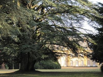 Das Schloss weist hohe Schieferdächer mit Kuppellaternen auf, umgeben von Landschaftsgärten mit einer Wasserallee und einer restaurierten Kapelle.