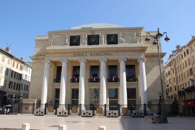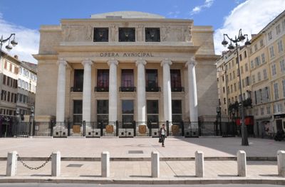 Die Oper von Marseille zeigt eine neoklassizistische Fassade mit ionischen Säulen und vier allegorischen Reliefs an ihrer Steinstruktur.