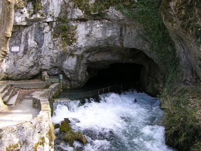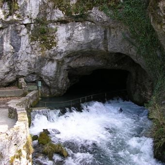 Die intermittierende Quelle von Fontestorbes entspringt einer Höhlenöffnung und erzeugt Wasserflussvariationen, die in regelmäßigen Zyklen auftreten.