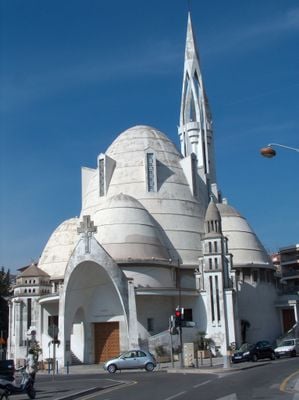 Die Kirche verfügt über einen 64 Meter hohen weißen Kirchturm, der sich über drei große eiförmige Kuppeln erhebt, gestützt von acht elliptischen Kuppeln.