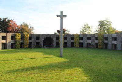 Die kreisförmige Struktur enthält 68 Krypten auf zwei Ebenen, mit Bronzetafeln, die die Namen der Verstorbenen an den Wänden jeder Kammer zeigen.