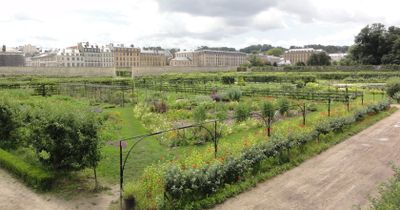 Der Garten verfügt über 5000 Obstbäume in spezifischen geometrischen Mustern, darunter 50 Birnensorten in speziellen Formen.