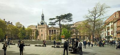 Der Charles-de-Gaulle-Platz erstreckt sich über 5000 Quadratmeter in trapezförmiger Form, mit dynamischen Wasserfontänen und zahlreichen Holzbänken entlang der Alleen.