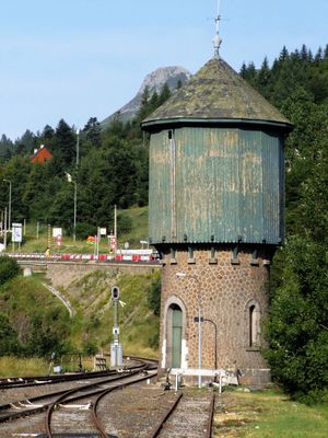 Wasserturm, Historischer Wasserturm an der Eisenbahnlinie in Laveissière, Frankreich.