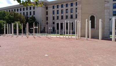 Das Armenische Genozid-Denkmal in Lyon besteht aus 36 weißen Betonelementen, die von Steinen aus Armenien nahe der Place Bellecour getragen werden.