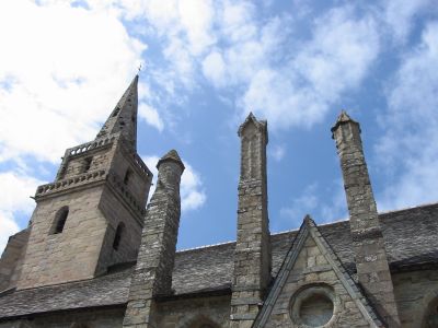 Eine romanische Krypta aus dem 12. Jahrhundert befindet sich unter der Kirche, während das Äußere rosa Granit und Schiefer in seiner Konstruktion vereint.