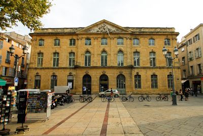 Das Steingebäude zeigt klassische Fassaden mit einem zentralen Giebel mit Skulpturen zwischen Place de l'Hotel-de-Ville und Place Richelme.