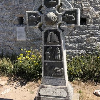 Dieses Kreuz zeigt die Verschmelzung frühchristlicher Symbolik mit keltischen Kunstelementen und präsentiert das regionale Erbe Nordwestfrankreichs.