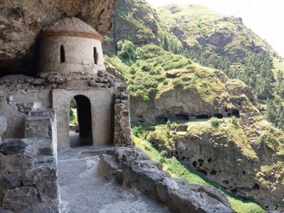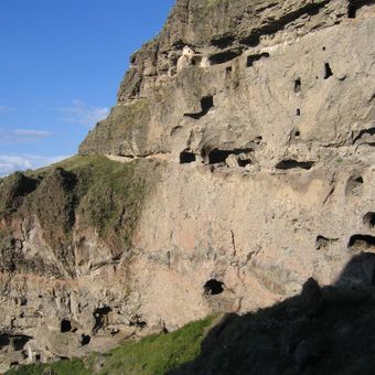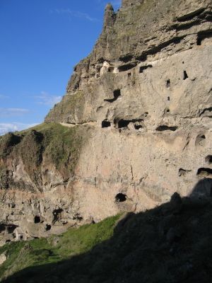 Das Vanis Kvabebi Kloster umfasst über 200 in eine 40 Meter hohe Felswand gehauene Höhlen mit unterirdischen Tunneln, Kirchen und Verteidigungsanlagen.