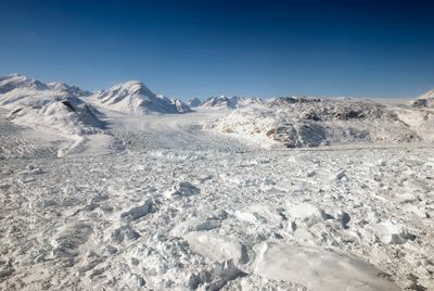 Der Kangerlussuaq-Gletscher fließt in den zweitgrößten Fjord Ostgrönlands und setzt zahlreiche Eisberge in den Nordatlantik frei.