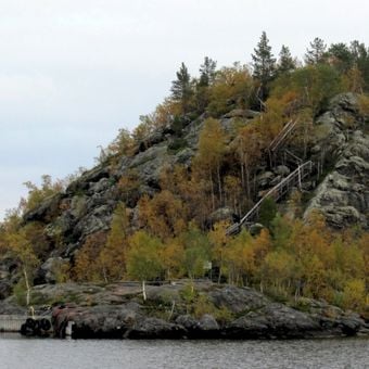 Die Felseninsel erhebt sich 30 Meter über dem Inarijärvi-See mit steilen Wänden und Geröllfeldern, die von weitem über das Wasser sichtbar sind.