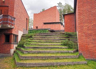Architekt Alvar Aalto gewann 1949 den Designwettbewerb mit einem Entwurf namens 'Curia', woraufhin zwischen 1949 und 1952 dieses Gemeindezentrum errichtet wurde.