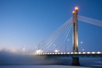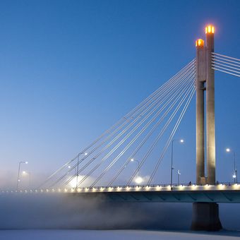 Die Brücke verfügt über 36 Natriumfluoreszenzlampen in zwei Pfeilern, die die Struktur beleuchten und ein charakteristisches Muster in der Stadt erzeugen.