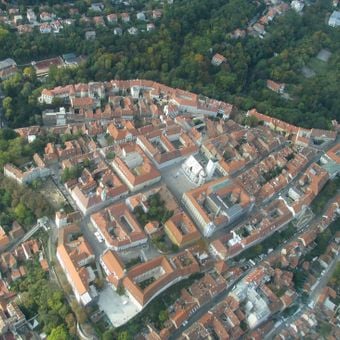 Gradec ist ein mittelalterliches Viertel auf einem Hügel über Zagreb mit kopfsteingepflasterten Straßen und Gebäuden aus verschiedenen Jahrhunderten. Die Architektur mischt Fachwerk, Barock und klassizistische Stile in einem dicht bebauten Areal.