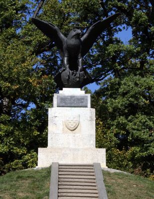 Der Falkenhügel weist Steinstufen auf, die zum Gipfel führen, wo eine Falkenstatue mit ausgebreiteten Flügeln auf einem Monument steht.