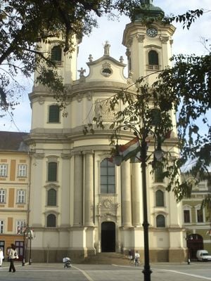 Das Kirchengebäude steht neben dem Dobó-Platz, mit dem Rathaus im Westen und dem Saint-Hedwig-Mädcheninternat im Osten.