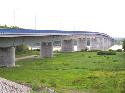 Die Brücke, erbaut im Jahr 2003, stellt einen wichtigen Fortschritt in der ungarischen Infrastrukturentwicklung als Teil des M9-Autobahn-Verkehrsnetzes dar.