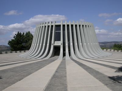 Das Yad Kennedy Memorial erhebt sich 60 Meter auf dem Berg Aminadav und zeigt eine zentrale Struktur in Form eines Baumstamms mit Bronzereliefs.