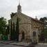 Das Steingebäude weist gotische Architekturelemente auf, mit detaillierter Handwerkskunst in den symmetrischen Fenstern und dem zentralen Glockenturm.