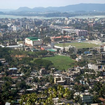 Guwahati ist eine Großstadt am Südufer des Brahmaputra im Bezirk Kamrup Metropolitan in Indien. Die Siedlung breitet sich über mehrere Hügel und flache Uferzonen aus, mit Tempeln auf erhöhten Punkten und Geschäftsvierteln entlang der Hauptstraßen.