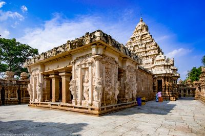 Der Kailasanathar-Tempel weist einen quadratischen Grundriss mit mehreren Schreinen, detaillierten Sandsteinskulpturen und einem vierstöckigen Turm über dem Hauptschrein auf.