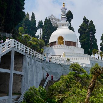 Die weiße Friedenspagode erhebt sich 28,5 Meter mit einem Durchmesser von 23 Metern an den Hängen der Jalapahar-Hügel in Darjeeling.