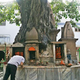 Neun Planetenstatuen und eine große Löwenstatue bewachen das Tempelgelände, während ein Banyanbaum die Idole von Lord Ganesh und Lord Hanuman beschützt.