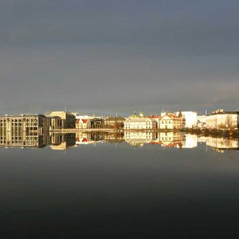 Das Rathaus von Reykjavík steht auf Betonpfeilern über dem Tjörnin-See und schafft eine visuelle Verbindung zwischen dem Gebäude und der Wasseroberfläche.