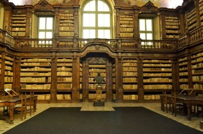 Die Bibliothek beherbergt über 159,700 Bände in einem Renaissancekomplex mit einer Kirche und zwei Kreuzgängen mit dekorativen Majolika-Fliesen.