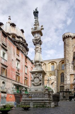 Die Januarius-Spitze erhebt sich 30 Meter hoch an der Kreuzung von Via Tribunali und Via San Gregorio Armeno mit Skulpturen von Heiligen und Engeln.