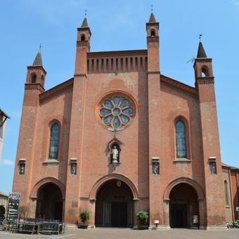 Die Kathedrale von Alba ist ein romanisches Bauwerk mit Terrakottamauern und einem zentralen Rosettenfenster, das die Fassade prägt. Die renovierte Fassade aus dem neunzehnten Jahrhundert zeigt Statuen der vier Evangelisten und einen mehrstöckigen Campanile.