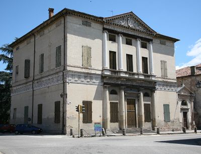 Villa Pisani ist ein Wohngebäude mit palladianischer Architektur in der Stadt Montagnana, die von mittelalterlichen Mauern umgeben ist. Der Bau zeigt symmetrische Anordnungen, klassische Säulen und einen großen Eingangsportal, das zur Stadt ausgerichtet ist.