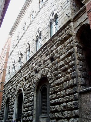 Der Palast zeigt eine Steinfassade mit rustikalem Mauerwerk im Erdgeschoss und zwei Reihen von Biforenfenstern in den oberen Etagen.