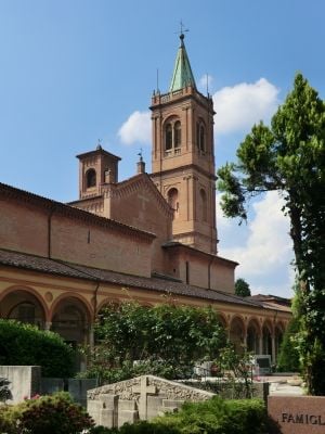 Die Kirche befindet sich auf dem Hauptfriedhof von Bologna und verbindet religiöse Funktionen mit Gedenkzwecken in einem architektonischen Umfeld.