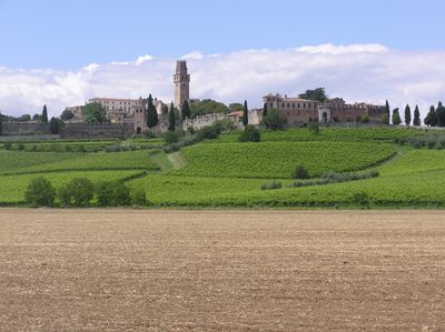 Das Castello San Salvatore erhebt sich auf einem Hügel inmitten von Weinbergen, mit Steinmauern und Türmen, die die Skyline der Provinz Treviso prägen.