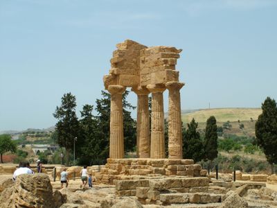 Der Tempel der Dioskuren ist ein antikes griechisches Heiligtum in der Valle dei Templi bei Agrigento mit vier aufrechtstehenden dorischen Säulen an der Fassade und mehreren weiteren Säulen auf den Langseiten. Das Gebäude zeigt die typischen Merkmale der dorischen Ordnung und war eines von mehreren bedeutenden religiösen Bauwerken dieser antiken Siedlung.