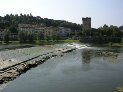 Die Pescaia di San Niccolò ist eine mittelalterliche Wehranlage, die sich über den Arno erstreckt und als Wasserbauwerk mit einem System von Barrieren und Kanälen fungiert. Die Struktur reguliert den Wasserfluss durch mehrere Öffnungen und lenkt das Wasser je nach Bedarf in verschiedene Richtungen.